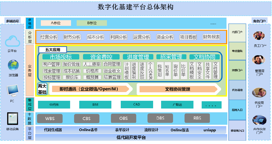數字新基建平臺助力企業推動數字化創新,通過低代碼構建平臺,建立全周期的項目管理平臺,通過業務橫向經營管理,組織層次縱向化,實現業務標準化管理,打造統一的、覆蓋全生命周期的項目管理系統。